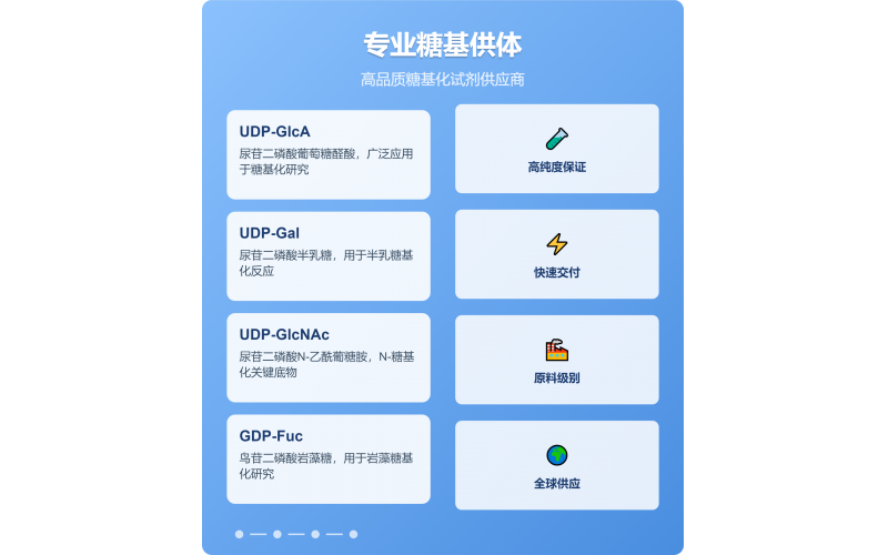 我们专注于提供一系列高品质的科研试剂和专业的技术服务,主要涵盖以下领域:特色生化试剂:公司提供包括糖基供体、化学原料以及转染试剂在内的多种核心产品。例如,我们专业生产诸如拉莫三嗪N2葡萄糖醛酸苷等药物代谢糖苷酸标准品,纯度高达99.9%,为药物研发与代谢研究提供了关键工具。