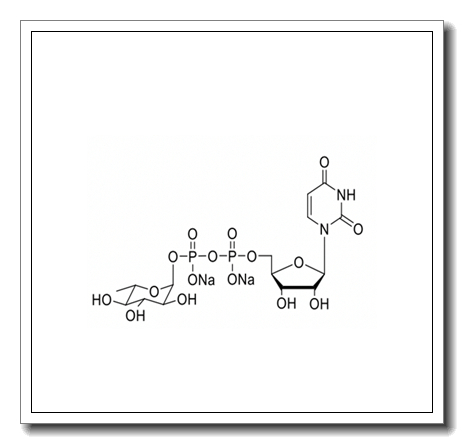| UDP-α-L-rhamnose disodium salt is a nucleotide sugar derivative where UDP is linked to α-L-rhamnose. The α-configuration refers to the stereochemistry at the anomeric carbon, while the L-configuration indicates the chirality of the sugar. The disodium salt form enhances solubility. UDP-α-L-rhamnose is a precursor for the synthesis of rhamnose-containing glycans, found in the cell walls of plants and some bacteria. |
