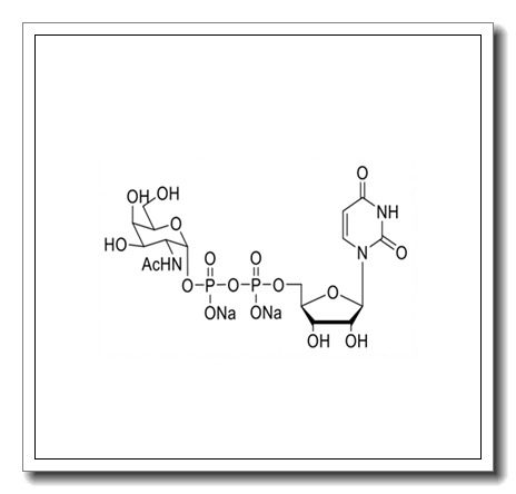 | UDP-N-acetyl-D-glucosamine disodium salt is a nucleotide sugar derivative where UDP is linked to N-acetyl-D-glucosamine, a sugar amine derivative of D-glucose with an acetyl group attached to the amino group. The disodium salt form ensures solubility. UDP-N-acetyl-D-glucosamine is a precursor for the synthesis of chitin and related polysaccharides, which are important components of the |